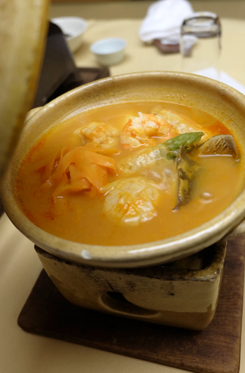 【とまと鍋 帆立貝、海老、烏賊、もち豚アスパラ巻き 他】です。