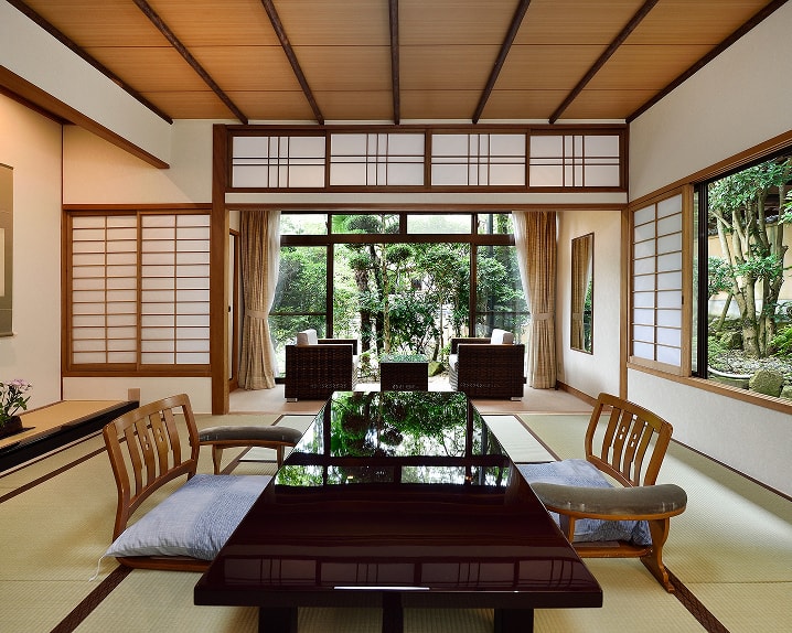 游月山荘のお部屋は、どこか懐かしい昭和の香りが漂います。七十年という歳月を経た游月山荘ならではの趣を感じていただけることでしょう。純和風の木の温もりに、寛ぎのひと時をお楽しみくださいませ。